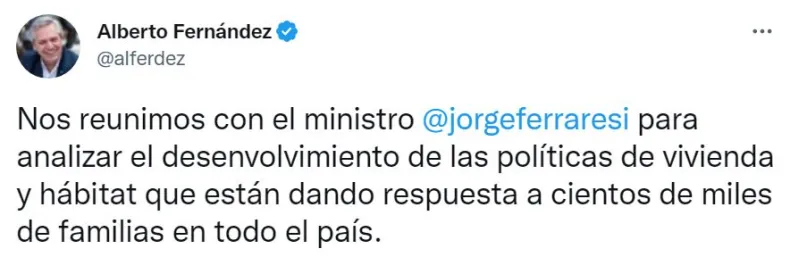 El hilo de Twitter fue acompañado por una foto junto a Ferraresi y a Maggiotti de una reunión en la que dijo que analizaron "el desenvolvimiento de las políticas de vivienda y hábitat que están dando respuesta a cientos de miles de familias en todo el país".