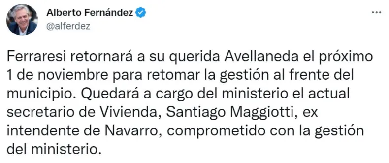 En su cuenta de Twitter, Fernández anunció que Ferraresi dejará su cargo el 1° de noviembre para volver a la intendencia de Avellaneda, puesto del que se había tomado licencia para sumarse a Nación. Y su reemplazo será el actual secretario de Vivienda y ex intendente de Navarro, Santiago Maggiotti.