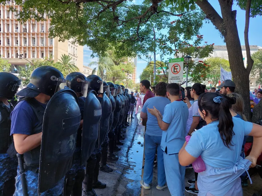 Médicos residentes del Hospital Perrando se manifestaron frente a Casa de Gobierno para pedir aumentos salariales para su sector y fueron desalojados de la calle por la Policía. "Somos la provincia con el peor salario del país", aseguró una de las trabajadoras de la Salud.
