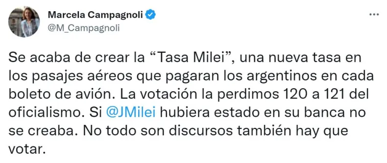 "Se acaba de crear la "Tasa Milei", una nueva tasa en los pasajes aéreos que pagaran los argentinos en cada boleto de avión. La votación la perdimos 120 a 121 del oficialismo. Si Milei hubiera estado en su banca no se creaba. No todo son discursos también hay que votar", continuó el descargo de Campagnolli.