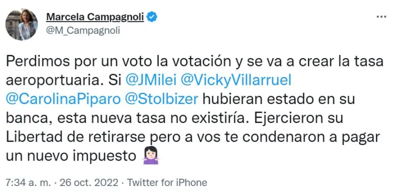 "Perdimos por un voto la votación y se va a crear la tasa aeroportuaria. Si Javier Milei, Victoria Villarruel, Carlina Píparo y Margarita Stolbizer hubieran estado en su banca, esta nueva tasa no existiría", señaló duramente la legisladora.