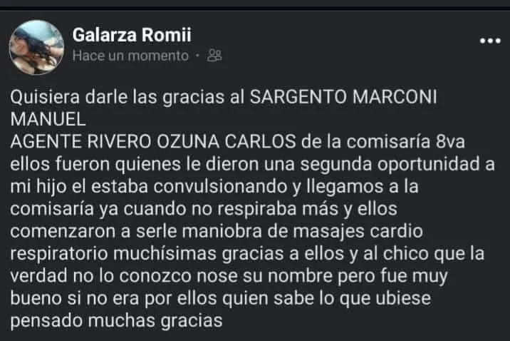 "Ellos fueron los que le dieron una segunda oportunidad a mi hijo, el estaba convulsionando y llegamos a la comisaría ya cuando no respiraba mas y ellos comenzaron a hacerle maniobra de masajes cardio respiratorio", escribió en su muro.