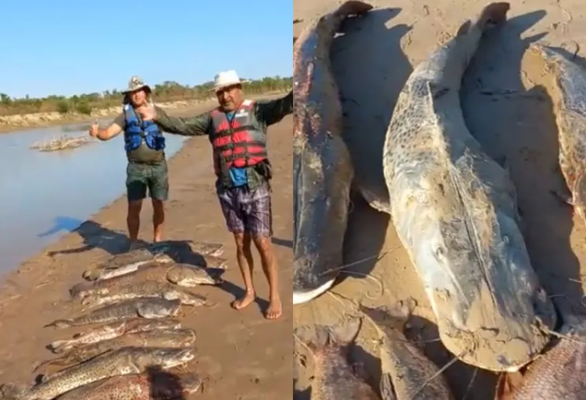 Asimismo, en el mismo se puede ver que los pescadores muestran con felicidad los aproximadamente 14 surubíes sobre la arena.