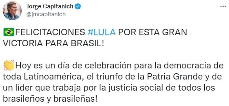 En esta línea, aseguró que esto resulta un "triunfo de la Patria Grande y de un líder que trabaja por la justicia social de todos los brasileños y brasileñas", explicó Capitanich. De esta forma, Brasil tendrá un gobierno socialista y popular luego del gobierno liberal del actual presidente.