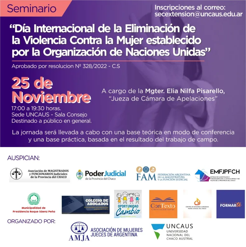 La Universidad Nacional del Chaco Austral invita a participar de este nuevo seminario que se realizará el 25 de noviembre en sala de consejo de la institución, ubicada en Presidencia Roque Sáenz Peña. Se realizará de 17 horas a 19:30 horas y estará a cargo de la jueza de la Cámara de Apelaciones, Mgter. Elia Nilfa Pisarello.