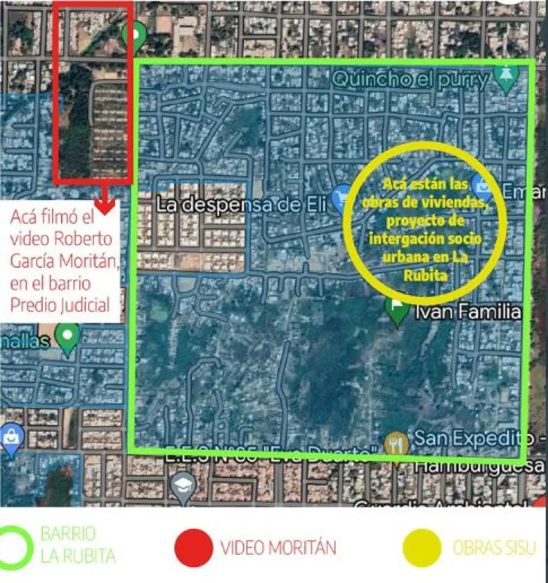 Asimismo, indica: "En su video, Moritán filma unas viviendas que no tienen nada que ver con esta ni ninguna otra obra del FISU y que no están en el barrio La Rubita. Es una mentira lisa y llana, que busca deslegitimar el Aporte de las Grandes Fortunas, el cual ejecutamos ya con gran eficacia".