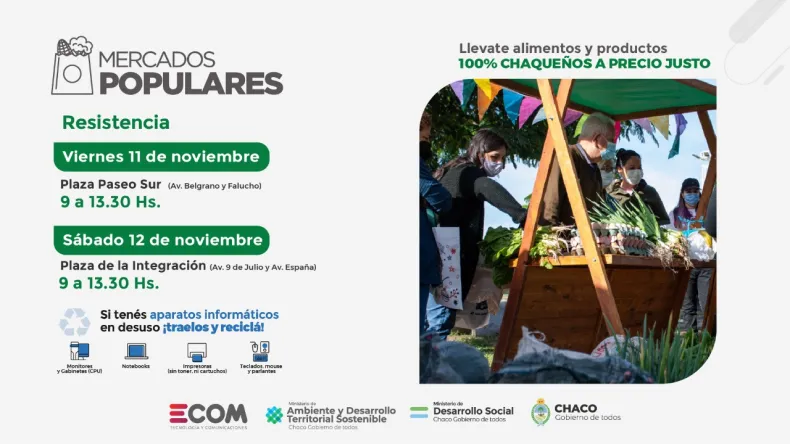 El Ministerio de Desarrollo Social realizará, este viernes y sábado, nuevos despliegues de Mercados Populares en Resistencia. La iniciativa apunta a "estimular el consumo de alimentos frescos y productos elaborados por emprendedoras, emprendedores y unidades productivas chaqueñas, llegando directamente a la mesa de las familias de distintas localidades".