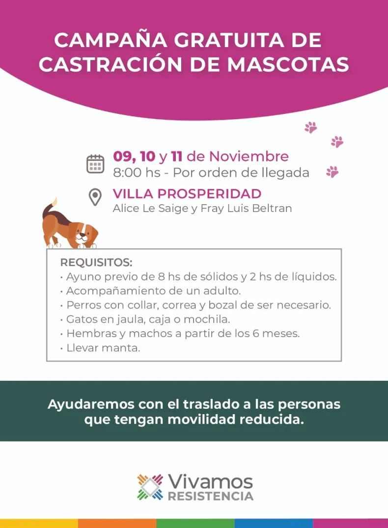 El programa "Mi Mascota", consistente en castración gratuita a perros y gatos, estará hasta el viernes 11 de noviembre próximo, en la esquina de las calles Alice Le Saige y Beltrán de Villa Prosperidad, a partir de las 8 horas.
