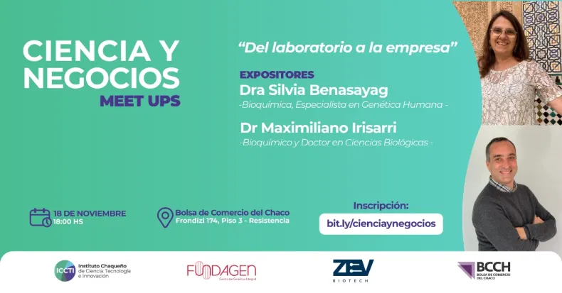El Instituto Chaqueño de Ciencia, Tecnología e Innovación (ICCTI) junto con la Bolsa de Comercio del Chaco invitan a participar de un nuevo encuentro del ciclo denominado "Meetups Ciencia y Negocios". El evento está destinado principalmente a grupos de investigación, empresarios e inversores que quieran conocer nuevos proyectos innovadores, vinculados principalmente a la ciencia y tecnología. Este encuentro tendrá como expositores a la Dra. Silvia Benasayag, directora de FundaGen e Inversora Angel de Empresas de Base Científica y el Dr. Maximiliano Irisarri, especialista en Ciencias Biológicas y fundador de la Startup Biotecnológica ZEV Biotech.