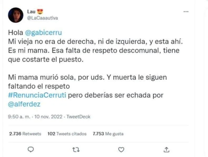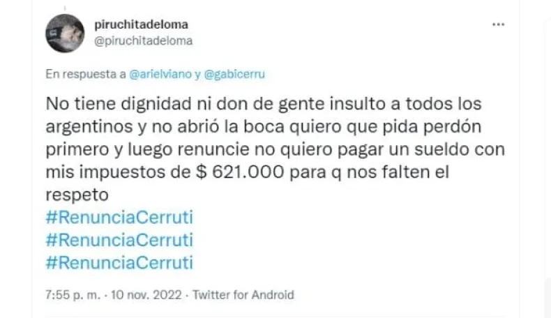 Sin embargo, los usuarios de Twitter no dejaron pasar esta situación y, bajo el hastag #RenunciaCerruti, desataron una catarata de comentarios negativos en contra de la funcionaria de la Casa Rosada.