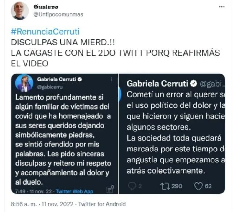 "La derecha ha puesto sus piedras recordando a los muertos del Covid", aseveró Cerruti. Producto de estas declaraciones, miles de argentinos se pronunciaron en contra al declarar esto sobre los fallecidos por la enfermedad.