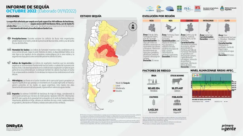 Por otra parte, los índices de humedad en suelos muestran malas condiciones en la zona central del país. Según la serie histórica de datos, la disponibilidad hídrica es la más baja en los registros de las estaciones meteorológicas de la zona núcleo y la segunda más baja para la zona central del país de los últimos 60 años.