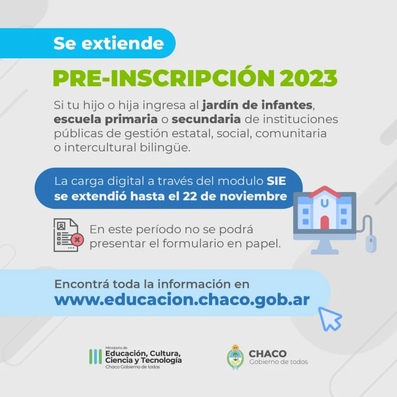Cabe recordar que esta preinscripción deben realizarla estudiantes que ingresen en 2023 a los niveles Inicial, Primario y Secundario de todas las unidades educativas públicas de gestión estatal, social y comunitaria, de las modalidades común y técnica. La misma se efectúa accediendo al módulo de SIE (Sistema Integral de Educación), a través del sitio gobiernodigital.chaco.gob.ar.
