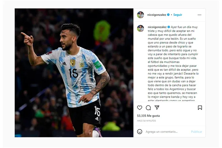 "El fútbol da muchísimas oportunidades y me toca dejar pasar está que es tan difícil de aceptar, pero no me voy a rendir jamás. Quiero desearle lo mejor a este grupo, familia, para lo que viene. Sin dudas van a dejar todo dentro de la cancha para hacer feliz a todos los argentinos y buscar eso que tanto queremos. Se merecen lo mejor siempre, banda y hoy voy a estar alentando como un argentino más. Gracias a todos los que se tomaron un segundo para desearme fuerzas en este difícil momento y vamos Argentina", finalizó.