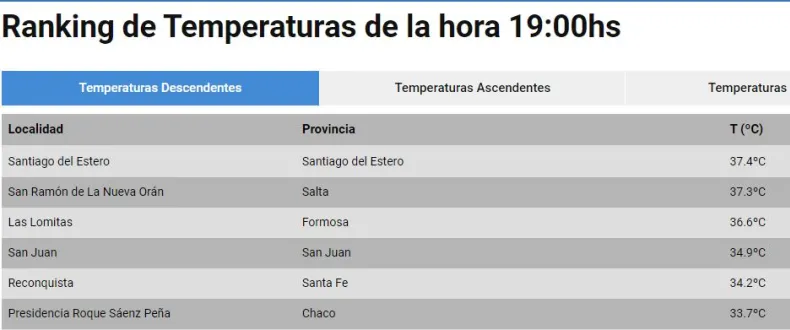 El ranking de las 19 horas esta liderado por Santiago del Estero que registró 37,4°C, seguido de San Ramón de La Nueva Orán, en Salta, con 37,3 °C. Ambas localidades se comparten el primer lugar a lo largo del día.