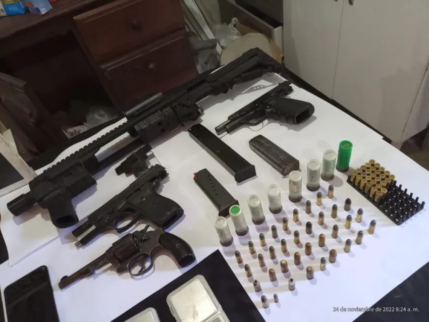 Sin embargo, también hallaron una mochila que en su interior contenía dos pistolas con sus cargadores 9 milímetros, un resolver calibre 32, 8 cartuchos calibre 9 mm, 8 cartuchos AT calibre 12/70, 27 cartuchos calibre 380 y un cargador de 9 mm con capacidad para 25 cartuchos.