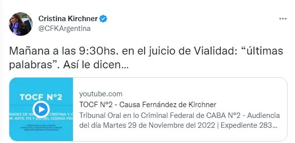 La confirmación lo hizo a través de su cuenta oficial de Twitter donde anticipó que la audiencia será a las 9:30. "Mañana, a las 9:30 horas, en el juicio de Vialidad: ‘últimas palabras’. Así le dicen…", escribió.