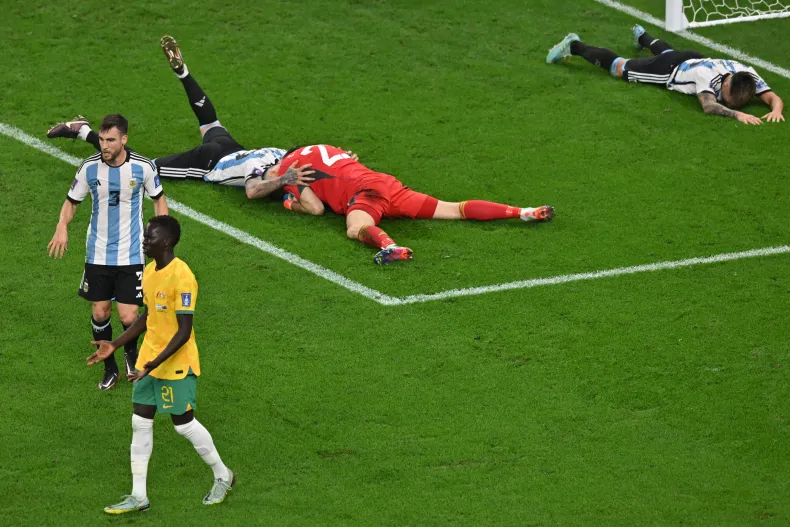 Tras varias chances desaprovheadas para poner el 3 a 1, Argentina tuvo que sufrir los últimos minutos, y sufrió hasta el último minuto, porque en el minuto 7 de adición, de 7 que el árbitro dio, Koul remató de media vuelta y el "Dibu", que no tuvo participación en el partido, achicó y con el brazo izquierdo detuvo el empate australiano.