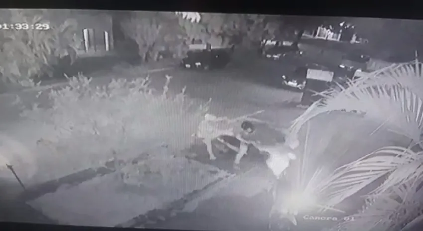 En las cámaras de seguridad de un vecino, quedó registrado el hecho de violencia y se ve que uno de los delincuentes se baja de una de las motos e intercepta al joven y le muestra un cuchillo, el mismo intenta retroceder y reciba una patada en la espalda que hace que se caiga al suelo.