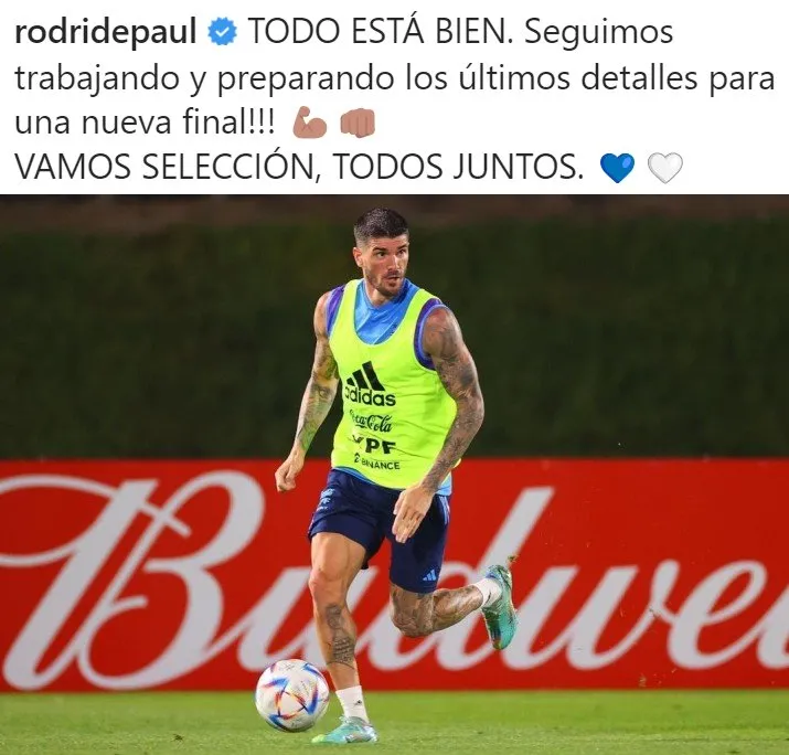 Tras conocerse que el mediocampista Rodrigo De Paul tiene una molestia muscular de cara al partido contra Países Bajos, el propio jugador se encargó de llevar tranquilidad a los argentinos a través de sus redes sociales: "Todo está bien", dijo.