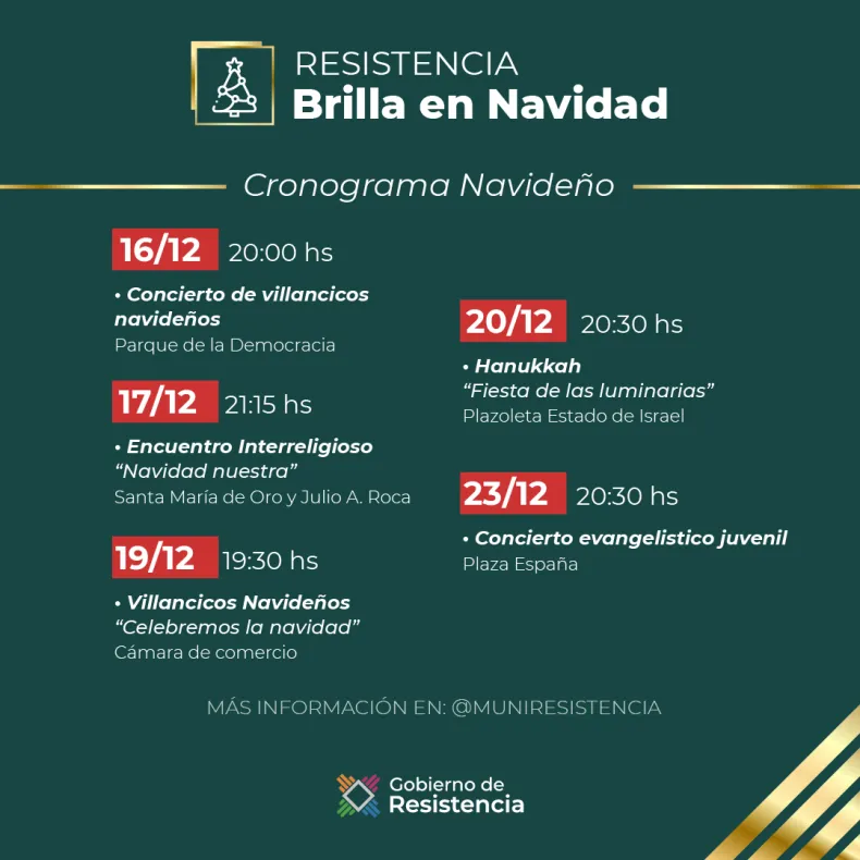 Y el sábado 17, encuentro interreligioso "Navidad Nuestra", previsto para las 21:15 en Santa María de Oro y Julio A. Roca (costado de Iglesia Catedral, que será una actividad articulada entre el Arzobispado, Mesa Interreligiosa y el padre Rafael Del Blanco. En ese lugar se interpretará la pieza musical Navidad Nuestra y Misa Criolla del Maestro Ariel Ramírez, a cargo de Las Nuevas Voces de Gerardo López (grupo folclórico Salta), Banda Municipal "Luis Omobono Gusberti" y el Coro Universitario y el Ballet Folclórico Corazón de Guacayán. Finaliza con Oración Interreligiosa a cargo de la Mesa Interreligiosa de la provincia del Chaco.