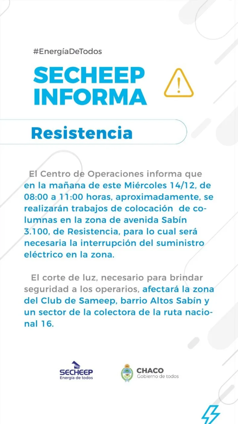 "Este miércoles, de 8 a 11, se realizarán trabajos de colocación de columnas en la zona de avenida Sabín 3100, de Resistencia, para lo cual será necesaria la interrupción del suministro eléctrico en la zona", detalló el comunicado.