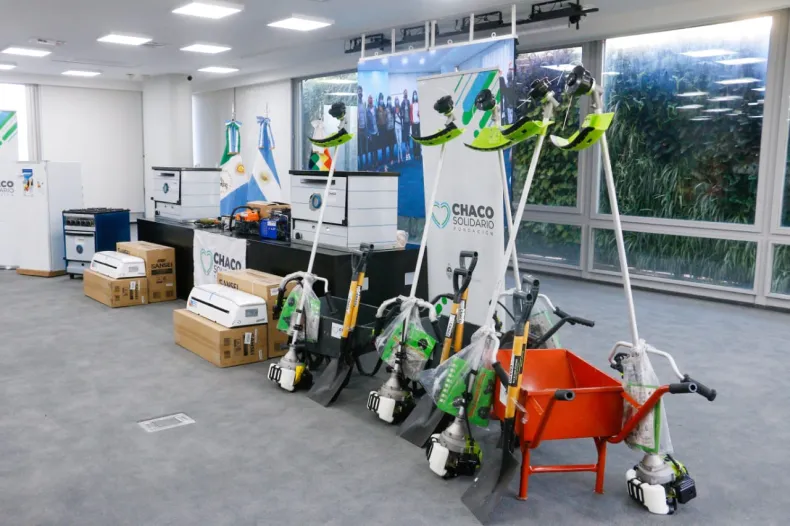 El Gobierno provincial entregó este viernes equipamiento y herramientas a emprendedores a través de la Fundación Chaco Solidario: hornos, kits de limpieza y de desmantelamiento, motosierra, cocina industrial, aires acondicionados y heladeras, por un monto total de $744.638 financiados por Lotería Chaqueña.