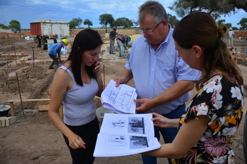 El intendente Sander junto a la presidenta del Concejo Deliberante, Soledad Rach, y la secretaria de Obras Públicas, Natalia Aguilar, recorrieron el predio donde se construyen nuevas soluciones habitacionales, que forman parte de un importante proyecto urbanístico para la zona norte de la localidad.