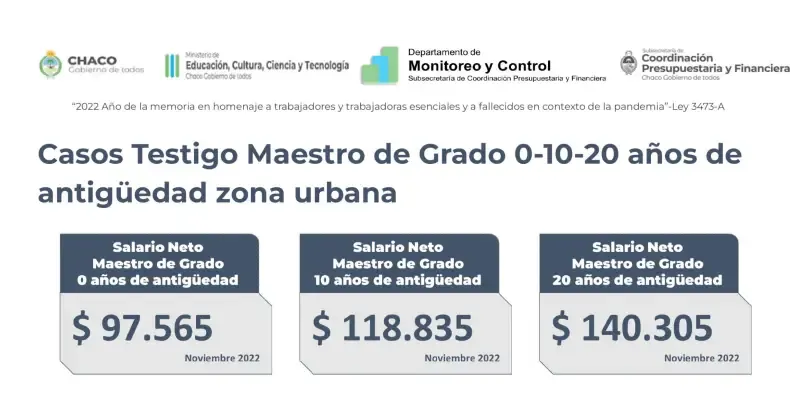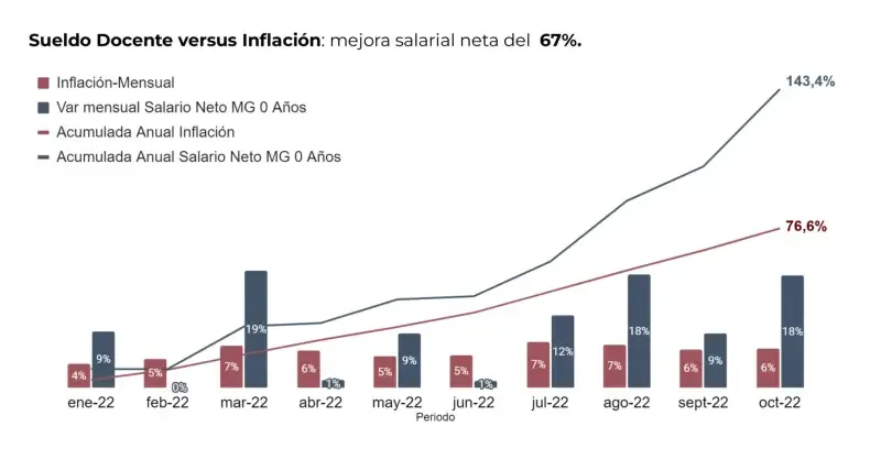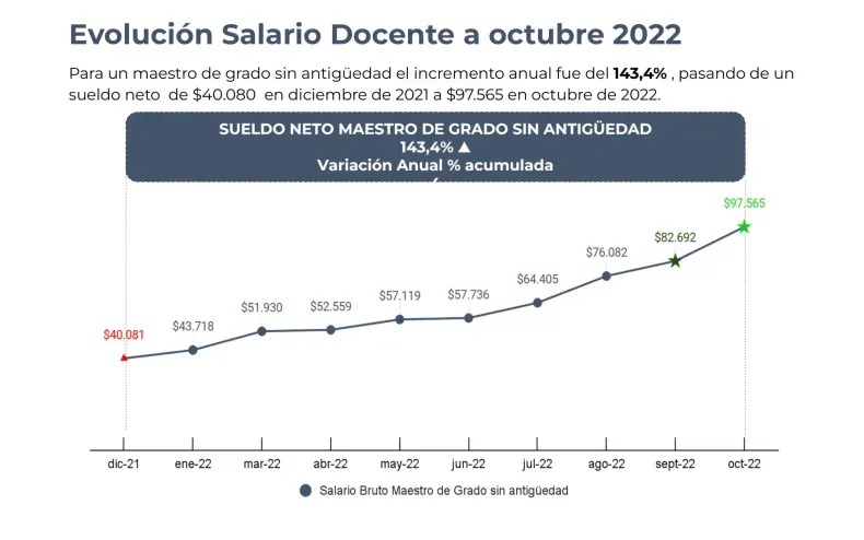 De acuerdo al informe del Departamento de Monitoreo y Control de la Subsecretaría de Coordinación Presupuestaria y Financiera, para un maestro de grado sin antigüedad el incremento anual fue del 143,4%, "pasando de un sueldo neto de $40.080 en diciembre de 2021 a $97.565 en octubre de 2022". En ese mismo periodo, el sueldo docente tuvo "una mejora salarial neta del 67% frente a la inflación".