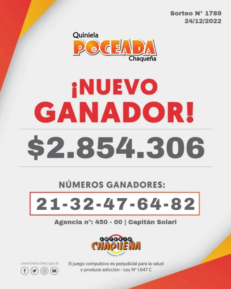 Este sábado se llevó a cabo el sorteo de la Quiniela Poceada Chaqueña y una persona oriunda de Capitán Solari se convirtió en el nuevo ganador de un pozo superior a 2 millones de pesos.