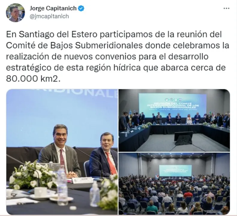 "En Santiago del Estero participamos de la reunión del Comité de Bajos Submeridionales donde celebramos la realización de nuevos convenios para el desarrollo estratégico de esta región hídrica que abarca cerca de 80.000 km2", escribió el gobernador de Chaco tras la reunión con el presidente.
