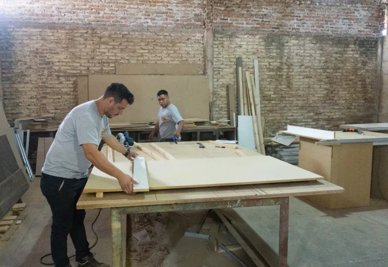 La fábrica ubicada en calle 6 entre 11 y 13 del barrio Belgrano, es propiedad de Héctor Toledo, quien junto a su esposa comenzó a trabajar fabricando muebles de melamina en el año 2020 y desde hace 9 meses cuentan con el taller en ese lugar.