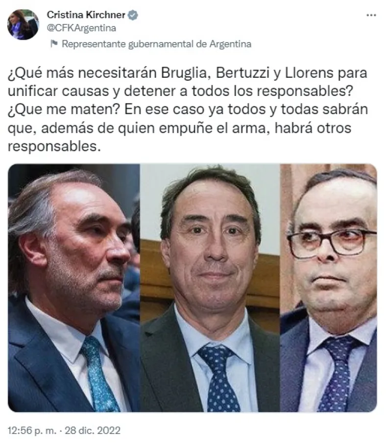 Y en el último mensaje fue contra los jueces Leopoldo Bruglia, Mariano Llorens y Pablo Bertuzzi. "¿Qué más necesitarán Bruglia, Bertuzzi y Llorens para unificar causas y detener a todos los responsables? ¿Qué me maten? En ese caso ya todos y todas sabrán que, además de quien empuñe el arma, habrá otros responsables", sostuvo.