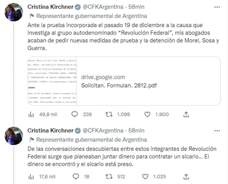 "Ante la prueba incorporada el pasado 19 de diciembre a la causa que investiga al grupo autodenominado Revolución Federal, mis abogados acaban de pedir nuevas medidas de prueba y la detención de Morel, Sosa y Guerra", precisó la exmandataria por los tres jóvenes que ahora están procesados.