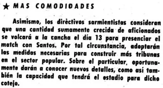 Como se mencionó anteriormente, la visita del Santos era un hecho histórico para la región. "El Territorio" se expresaba de la siguiente manera: "No siempre el aficionado del interior del país tiene posibilidades de apreciar espectáculos de jerarquía mundial, como ocurre con el que está radicado en la Capital Federal. La labor iniciada el año pasado por el Club Sarmiento, constituye a un hecho sin precedentes en el historial de los espectáculos deportivos organizados en nuestro medio." Tal era la importancia del evento para la provincia que desde la Gobernación se habían dispuesto trenes gratis desde localidades del interior como Sáenz Peña o Fontana.