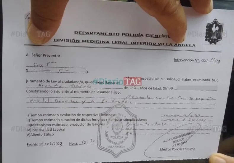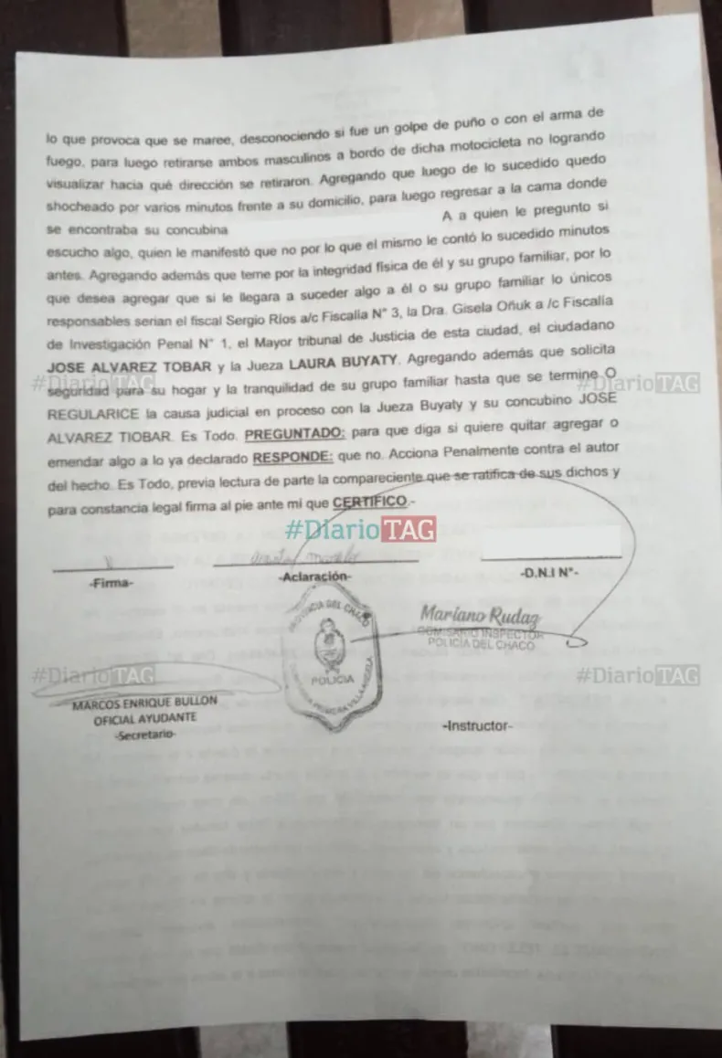 En la denuncia presentada en la Comisaría Primera de Villa Ángela, consta que Marcelo "teme por su integridad física y la de su grupo familiar", por lo que solicitó asentar que "si le llegara a suceder algo" a él o a su familia, "los únicos responsables serían el fiscal Sergio Ríos, a cargo de la Fiscalía N°3, la doctora Gisela Oñuk, a cargo de la Fiscalía de Investigación Penal N°1, el Superior Tribunal de Justicia de la ciudad, el ciudadano José Álvarez Tobar y la jueza Laura Buyatti".