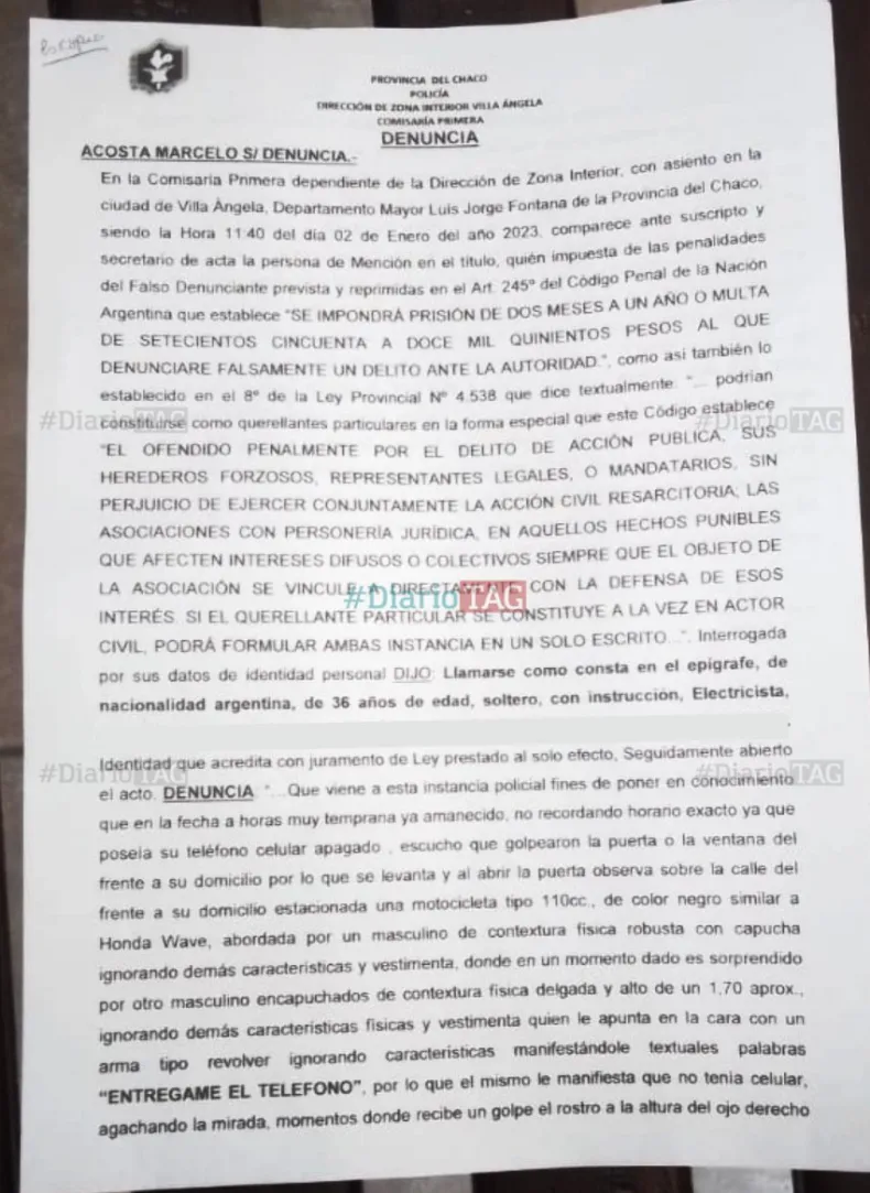Este martes, Marcelo detalló a este medio los hechos acontecidos en la madrugada del lunes. "Estaba amaneciendo, me golpean la puerta, me levanto a abrir y veo una persona encapuchada en una moto. En eso otra persona al costado me apunta con un revolver en la cara, un flaco alto era, también encapuchado", relató el albañil sobre los hechos denunciados en la Comisaría Primera de Villa Ángela.