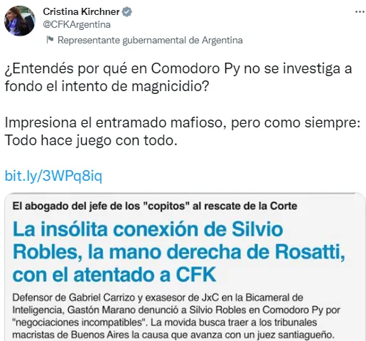 En el marco del enfrentamiento entre gran parte del oficialismo y la Corte Suprema de Justicia por la devolución de la coparticipación hacia el Gobierno de la Ciudad de Buenos Aires, la vicepresidente de la Nación realizó un breve descargo en su Twitter personal en el que cuestionó duramente a Silvio Robles, mostrando una nota publicada por el medio Página 12, donde se lo acusa al mismo de "mano derecha" de Horacio Rosatti, presidente de la Corte Suprema.