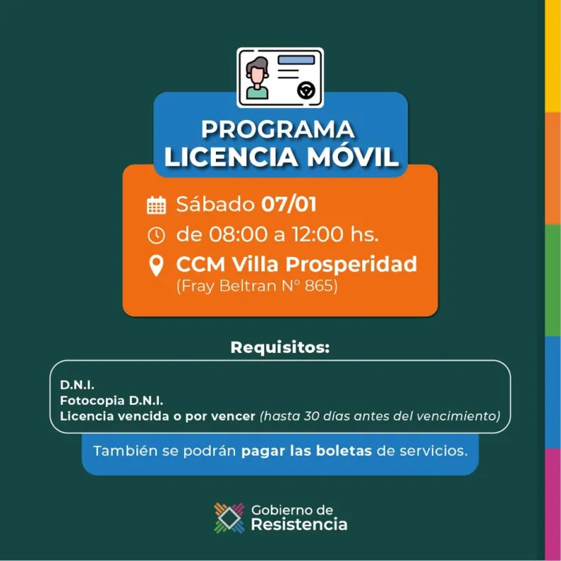 Este sábado 7 de enero, el programa "Licencia Móvil", que acerca a los vecinos la posibilidad de obtener o renovar su habilitación para conducir, estará de 8 a 12 horas en el Centro Comunitario Municipal de Villa Prosperidad, ubicado en Fray Beltrán 865. Las personas interesadas deben concurrir con DNI y fotocopia, además de la licencia vencida o por vencer.