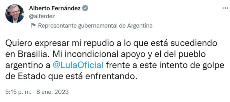"Quiero expresar mi repudio a lo que está sucediendo en Brasilia. Mi incondicional apoyo y el del pueblo argentino a Lula da Silva frente a este intento de golpe de Estado que está enfrentando", sostuvo el mandatario argentino.