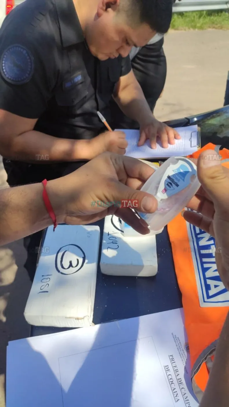 Según consta en el informe policial al que puso acceder Diario TAG, al momento de ser palpados en el control, el personal policial encontró, pegados a sus cuerpos, tres paquetes rectangulares que contenían cocaína.
