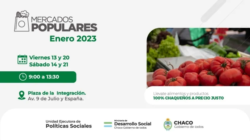 Este fin de semana vuelven los Mercados Populares al Gran Resistencia. Será este viernes y sábado, de 9 a 13.30 en la Plaza de la Integración, en la intersección de las avenidas 9 de Julio y España. Los vecinos podrán adquirir productos de primera calidad y a precios promocionales entre alimentos, regalaría, artesanías y elaboraciones textiles.