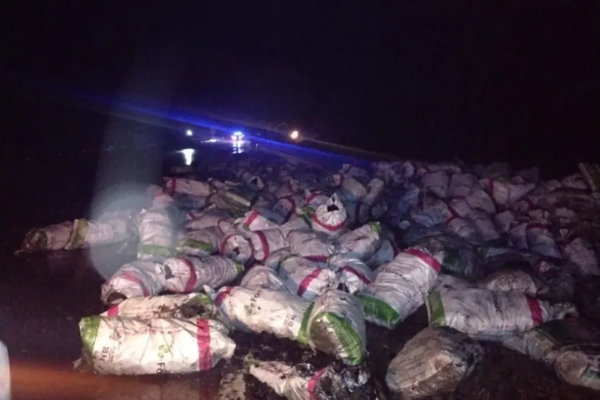 Rutas peligrosas tras las lluvias: un camión volcó su cargamento de bolsas de carbón en la madrugada