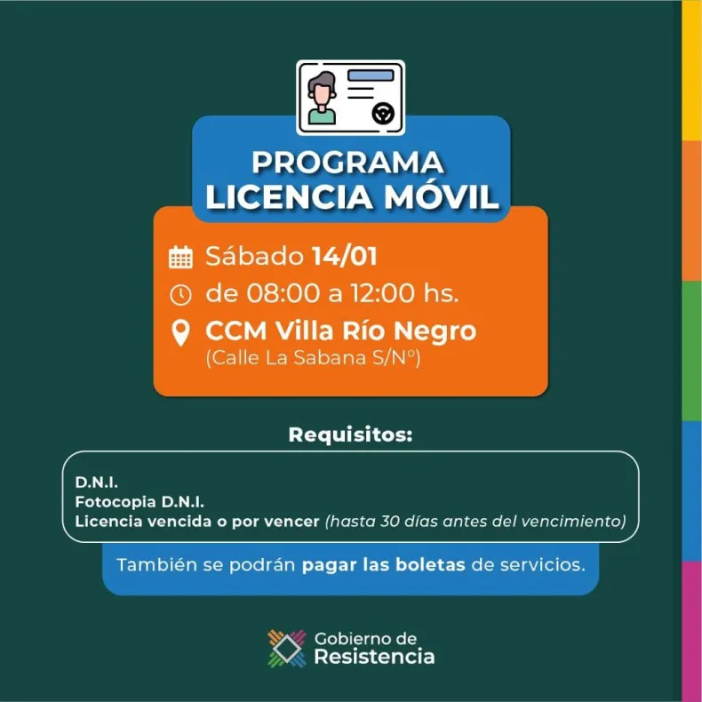 El sábado, a partir de las 8 horas y hasta el mediodía, los vecinos de Villa Río Negro y alrededores podrán formar parte de los programas de renovación de carnets de conducción. Los interesados podrán acercarse al Centro Comunitario Municipal de Villa Río Negro, situado en calle La Sabana S/N. También se podrán realizar los trámites en la Dirección de Licencia de Conducir, en Monteagudo 141.