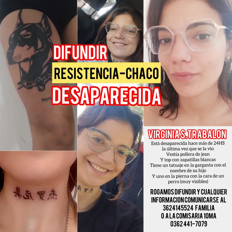 La persona que se encuentra desaparecida se trata de Virginia S. Trabalon de 24 años. La última vez que se la vio portaba una pollera de jean, un top gris con zapatillas blancas. Tiene un tatuaje en la garganta con el nombre de su hijo y otro en la pierna con la cara de un perro, El tatuaje es de tamaño notablemente visible. La desaparición se da el sábado por la noche después de tomar tereres con una vecina en el barrio Toba.