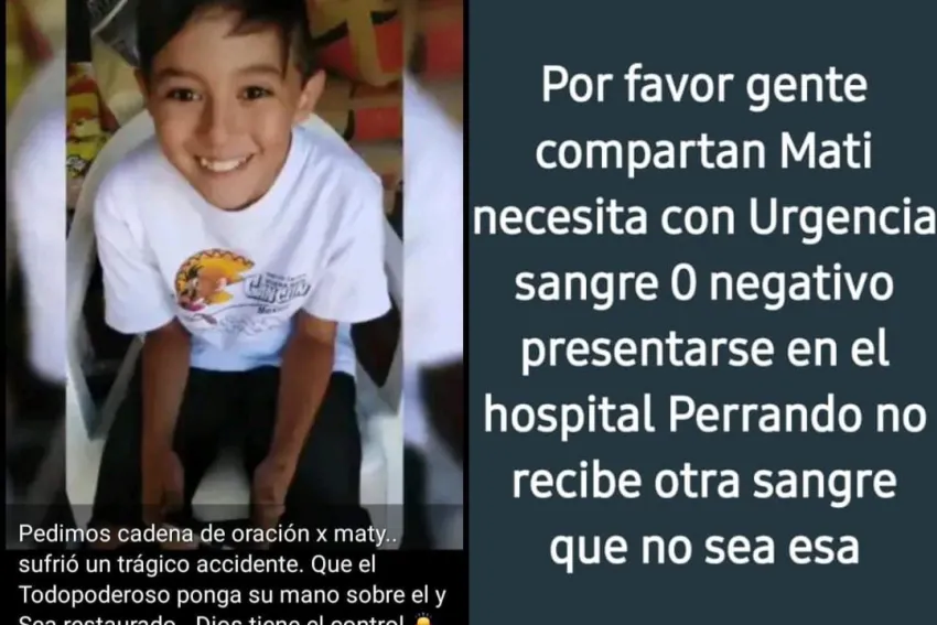 Como resultado de esto, Matías quedó con los brazos, piernas y cabeza fracturada, hecho por el que fue derivado al Hospital Perrando de Resistencia. Según comunicó el personal médico del lugar, el niño tiene el último sachet de sangre, por lo que la familia pide con urgencia ayuda de factores 0 negativo para continuar con la atención médica.