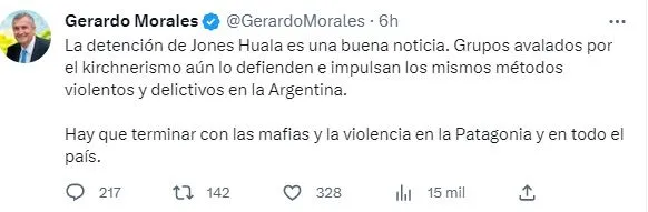 Por otra parte, el gobernador de Jujuy y presidente de la UCR, Gerardo Morales, destacó que la detención es una "buena noticia" y le pego a los grupos kirchneristas que "defienden e impulsan los métodos violentos y delictivos en la Argentina. Por último, pidió terminar con "las mafias y la violencia en la Patagonia".