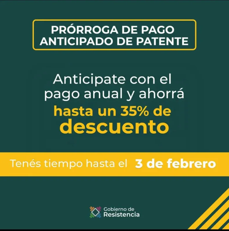 El Municipio de Resistencia recuerda que hasta este viernes 3 de febrero existe la posibilidad de acceder a los beneficios por el pago anual anticipado de la patente de vehículos. Con horarios tanto de mañana como por la tarde, el contribuyente dispone de varias alternativas para acogerse a este sistema que propone descuentos hasta el 35 por ciento.