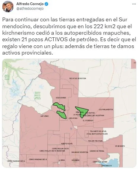 A este reclamo, se sumó Alfredo Cornejo, senador por la UCR, que realizó una grave denuncia señalando que las tierras que Nación ordenó a entregar a los grupos autodenominados mapuches contienen 21 pozos activos de petróleo.