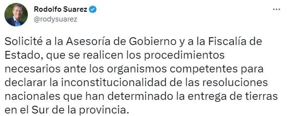 "Solicité a la Asesoría de Gobierno y a la Fiscalía de Estado, que se realicen los procedimientos necesarios ante los organismos competentes para declarar la inconstitucionalidad de las resoluciones nacionales que han determinado la entrega de tierras en el Sur de la provincia", exclamó en su Twitter personal el gobernador de Mendoza, Rodolfo Suárez, con respecto a la polémica que rodea la resolución del Instituto Nacional de Asuntos Indígenas (INAI) a ceder 21.500 hectáreas de tierra a grupos mapuches.